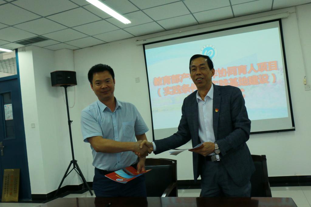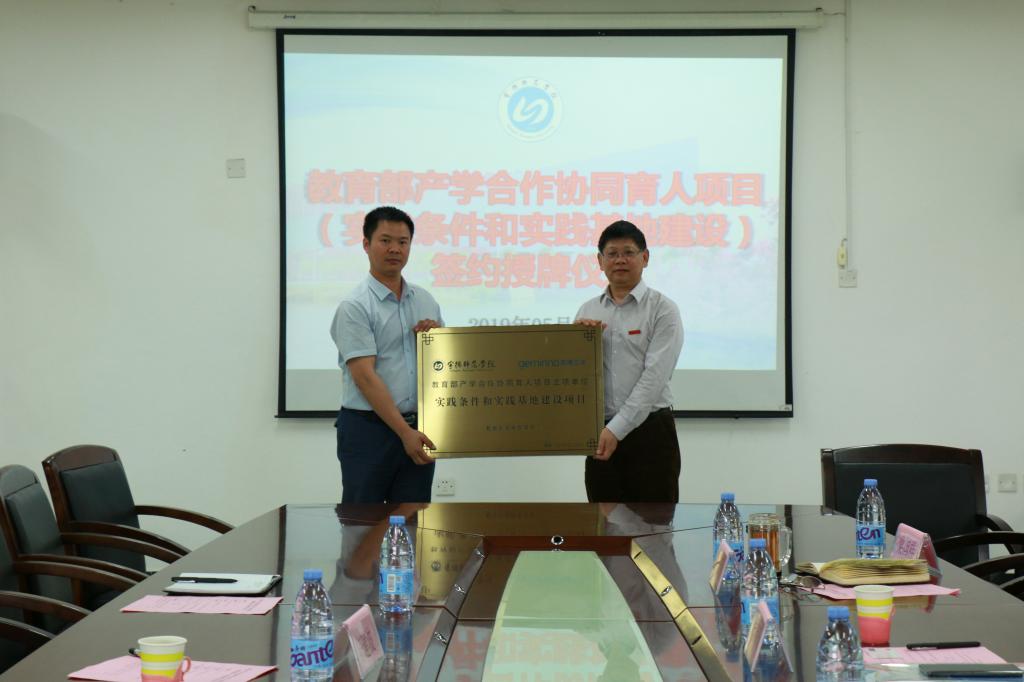 我院党委书记陈茂和与高博应诺副总经理陈建波分别代表校企双方进行签约,由苏州高博应诺为我院授牌“教育部产学合作协同育人项目立项单位实践条件和实践基地建设项目”,双方合影留念。
