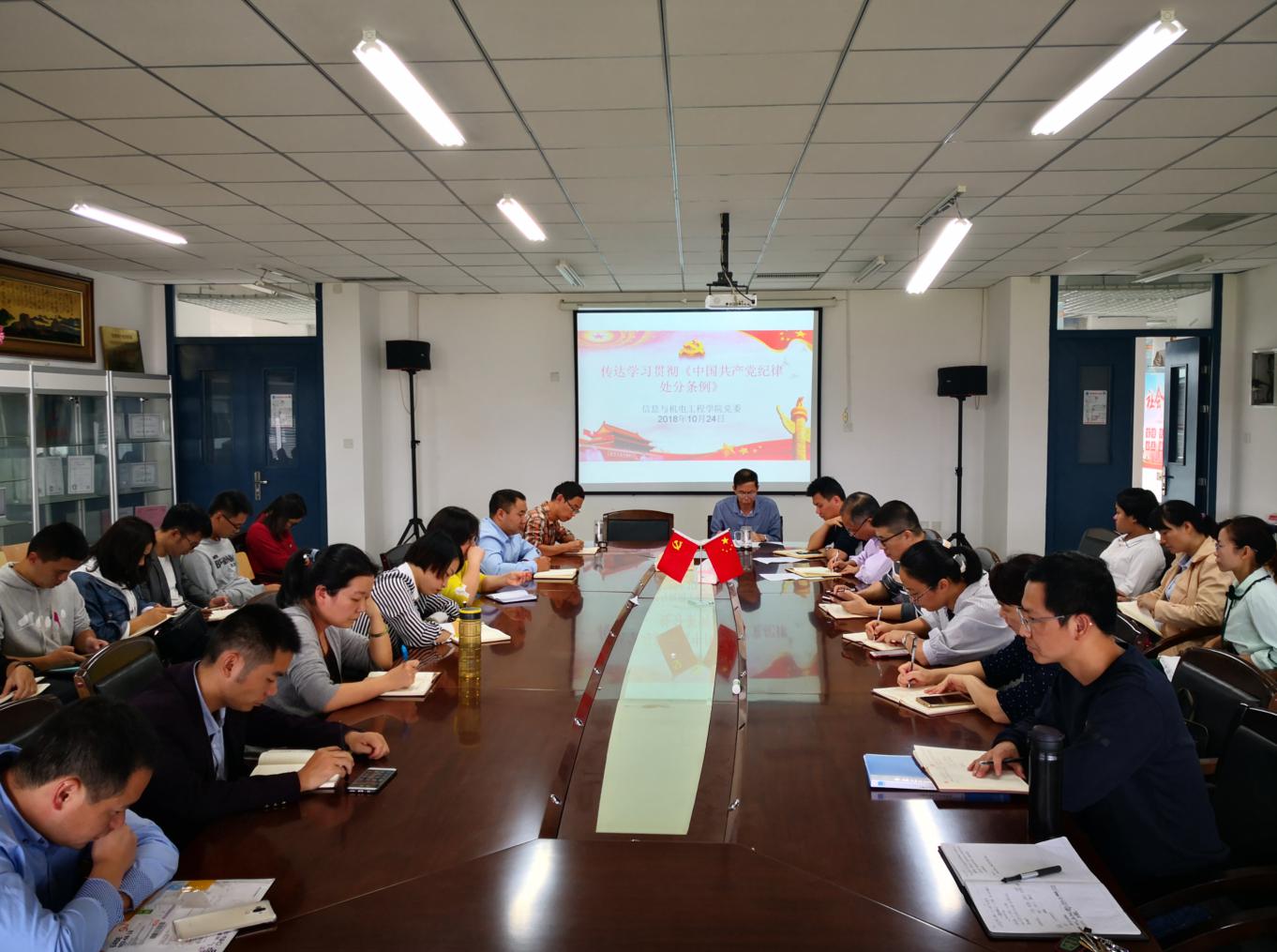 2018年10月24日下午,宁德师范学院信息与国产又黄又粗党委组织学院全体教职工党员召开学习会议,专题学习新修订的《中国共产党纪律处分条例》(以下简称《条例》)。信息与国产又黄又粗党委书记陈茂和主持会议。