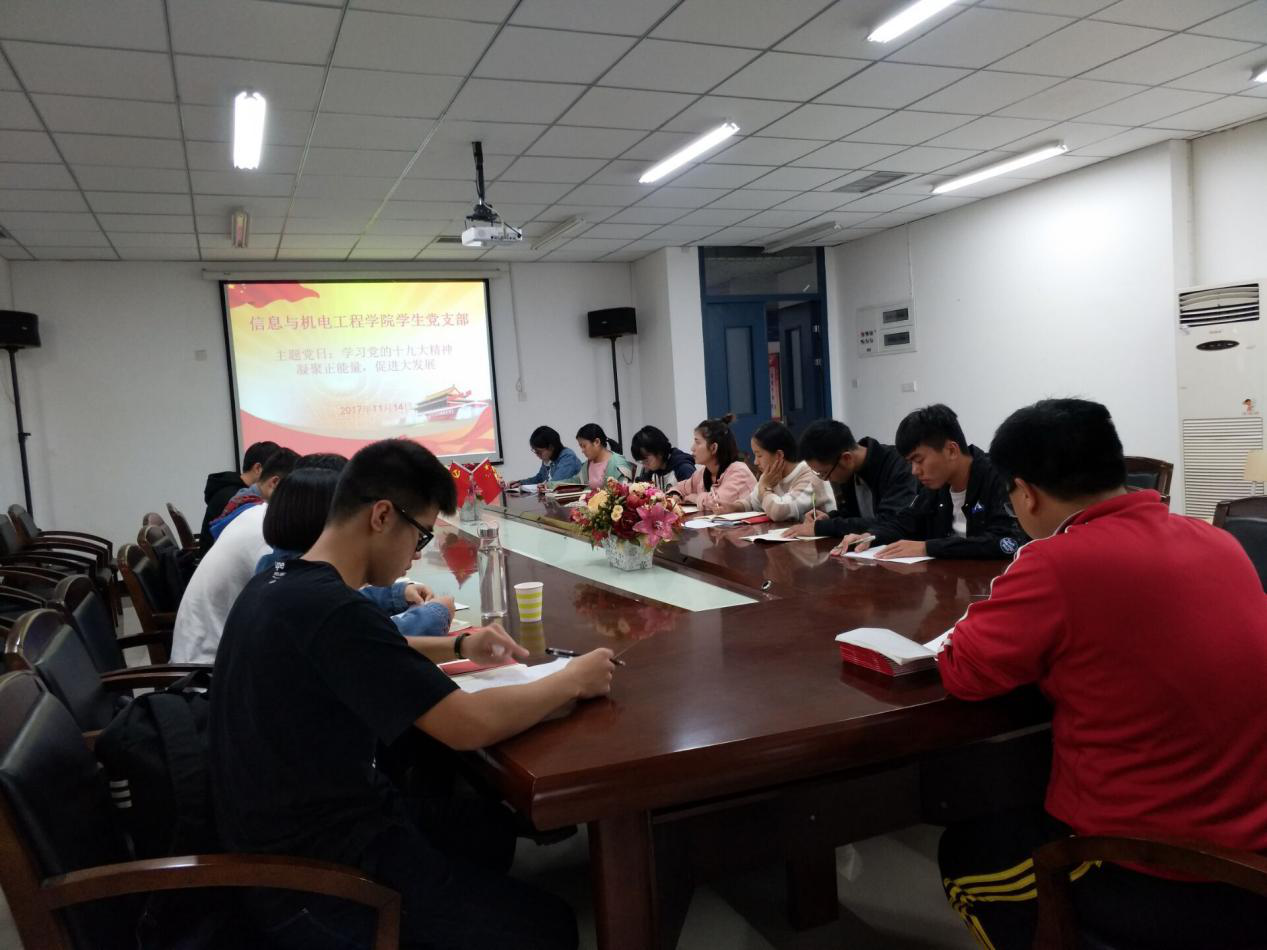 为进一步统一思想、凝聚共识,教育引导信息与国产又黄又粗机电系学生党支部全体党员不忘初心、牢记使命,把十九大精神转化为强大动力。2017年11月14日下午,机电系学生党支部全体师生党员在求是楼DA408会议室参加了“学习党的十九大精神,凝聚正能量,促进大发展”主题党日活动。