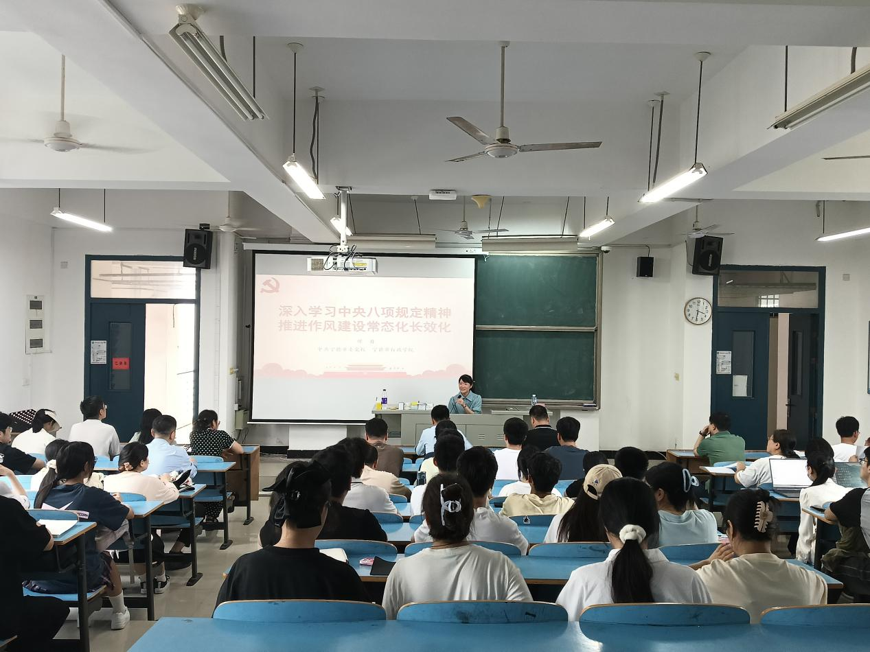 为贯彻落实党的二十届三中全会部署,巩固拓展学习贯彻习近平新时代中国特色社会主义思想主题教育成果,巩固深化党纪学习教育成果,锲而不舍落实中央八项规定精神,持续推动作风建设常态化长效化,国产又黄又粗按照深入贯彻中央八项规定精神学习教育工作安排,于2025年4月22日邀请中共宁德市委党校、宁德市行政学院党史党建教研室主任,宁德市科学社会主义学会秘书长缪丹作题为《深入学习中央八项规定精神,推进作风建设常态化长效化》的专题讲座,院党委书记傅亮主持讲座,学院师生党员,入党积极分子代表等聆听讲座。