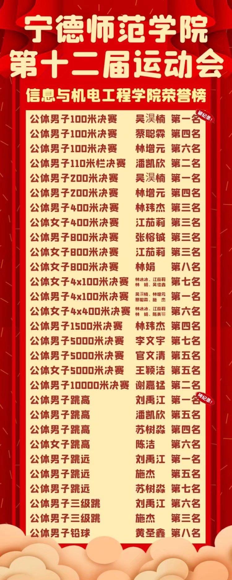 11月24日, 我校第十二届运动会开幕式暨2021级新生军训成果汇演在东侨校区田径场举行。经过三天紧张、激烈、有序的角逐,运动会落下帷幕。碧蓝苍穹下,我院运动员们发扬踔厉,步伐矫健,气宇轩昂。我院运动员屡创佳绩,在公体男子跳高比赛、公体男子100决赛两项比赛中打破校级记录。在全体志愿者的共同努力和啦啦队同学们奋力的呐喊声中,运动员们还在众多项目中都崭露头角。最终获得公体组总分第四名的成绩。