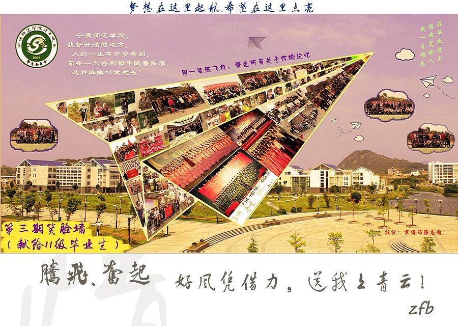 近日,一走进求是楼大厅一架构思独特的“纸飞机”造型笑脸墙映入眼帘,这是计算机系送给14届毕业生的特殊礼物,“飞机”主体是由毕业班同学从军训以始的活动相片组成,这些过去的剪影给我们以回忆,予我们以心灵的慰籍。忘掉生活的艰辛,忘掉烦恼,忘掉忧愁,……