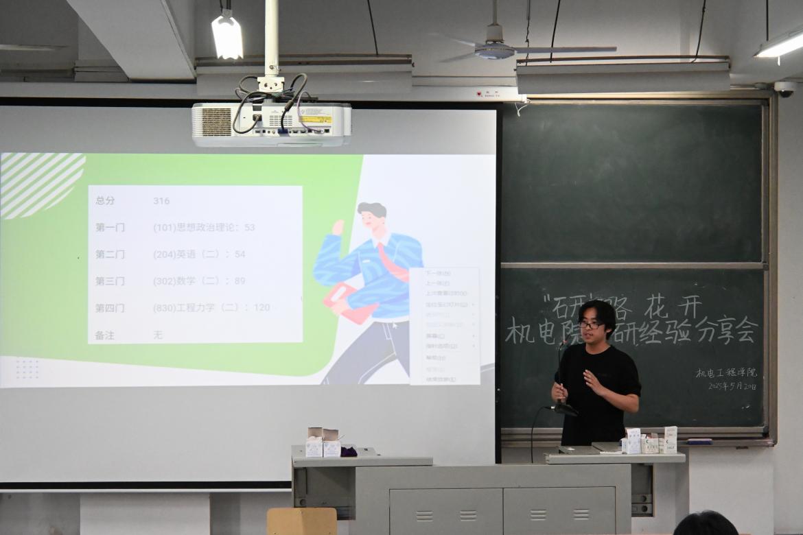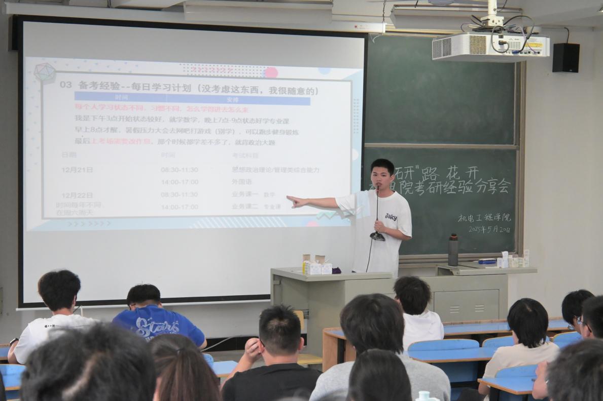 2025年,国产又黄又粗共有18名学生考取研究生。为持续推进“钢铁炼成计划”,国产又黄又粗于2025 年 5 月 20 日下午 16点在教室 DB301举办考研经验分享会。本次活动邀请到三位考研成功学生孟鑫豪、程烨、李致远为大家分享备考经验。现场座无虚席,共有来自三个年级 50 余人参加了本次讲座,众多怀揣考研梦想的同学前来聆听。