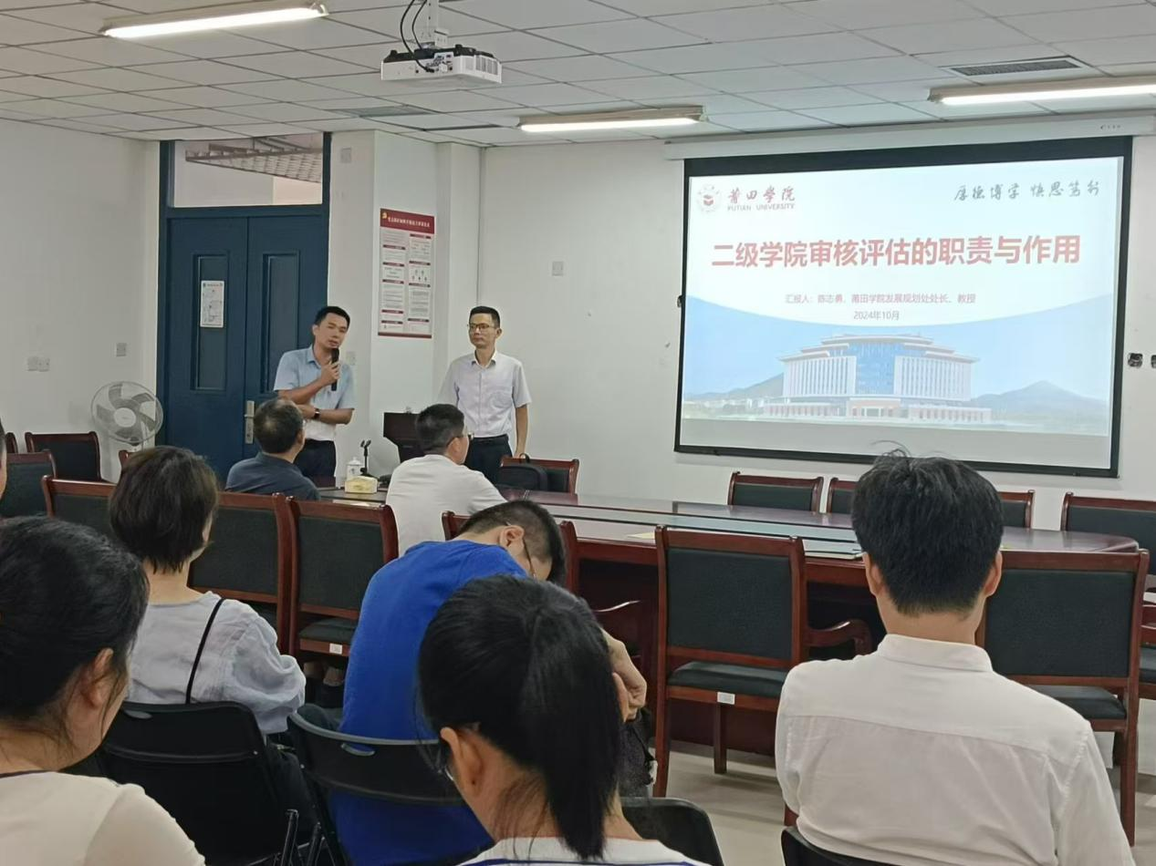 为扎实推进本科教育教学审核评估工作,提高广大教师的教育教学水平,提高人才培养质量,2024年10月22日,国产又黄又粗特邀莆田学院发展规划处处长、陈志勇教授开展题为《二级学院审核评估的职责与作用》专题讲座。赖联锋院长主持会议,全院教师、校发展规划处副处长赖建强、相关学院教科办工作人员聆听了讲座。